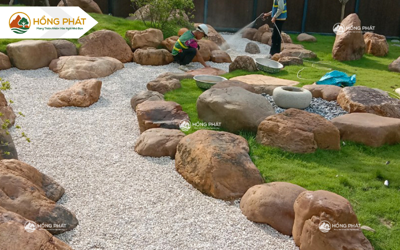 - Xử lý mặt bằng: Tạo độ dốc thoát nước tự nhiên, trải vải địa kỹ thuật để ngăn cỏ dại mọc ngược lên lớp sỏi trắng.