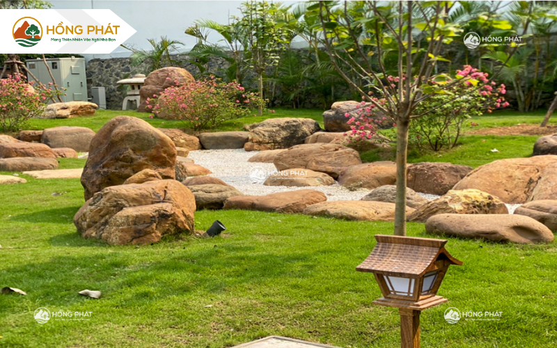 - Hiệu ứng thị giác: Các khối đá nằm rải rác nhưng liên kết chặt chẽ, mô phỏng những đỉnh núi hoặc gò đồi tự nhiên nhô lên giữa dòng suối. Kỹ thuật chôn chân đá sâu xuống đất tạo cảm giác vững chãi, như thể chúng đã mọc ở đó từ hàng trăm năm trước.